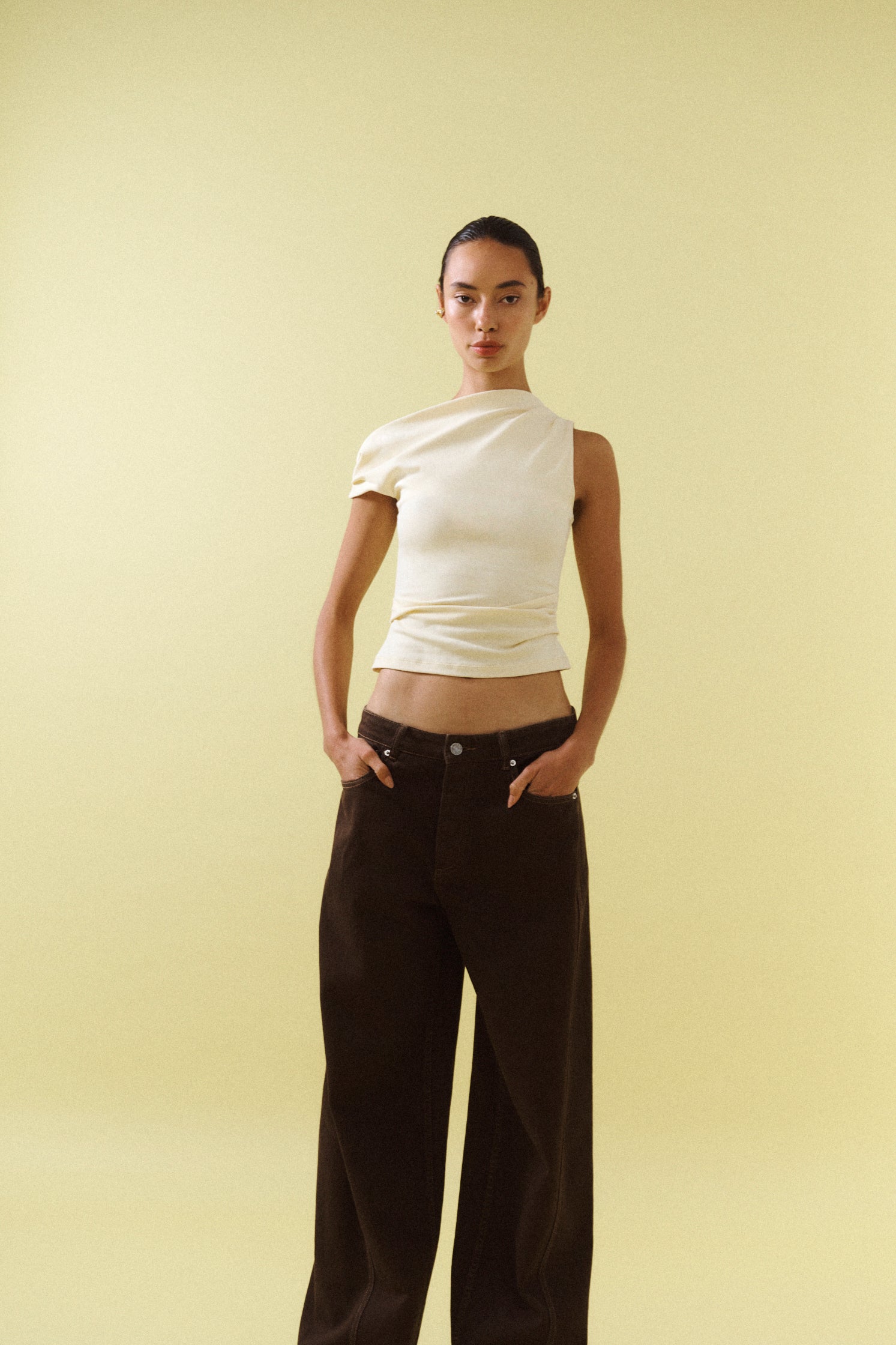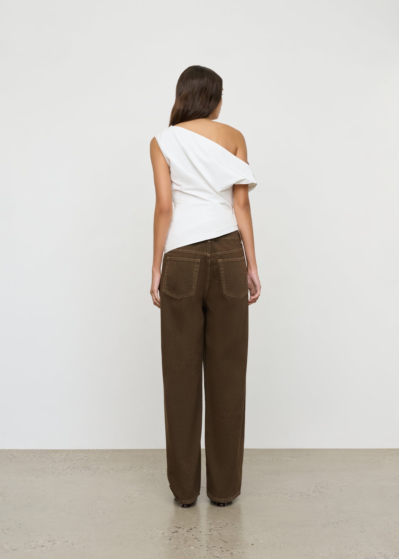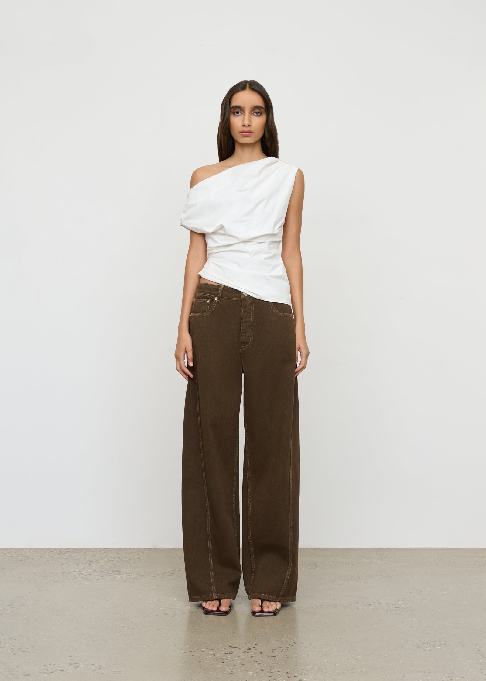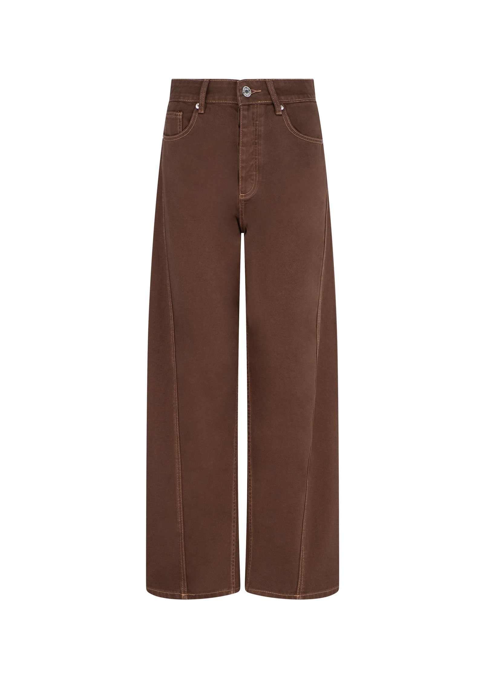 A mid rise, subtle barrel leg jean with angled seam detail.