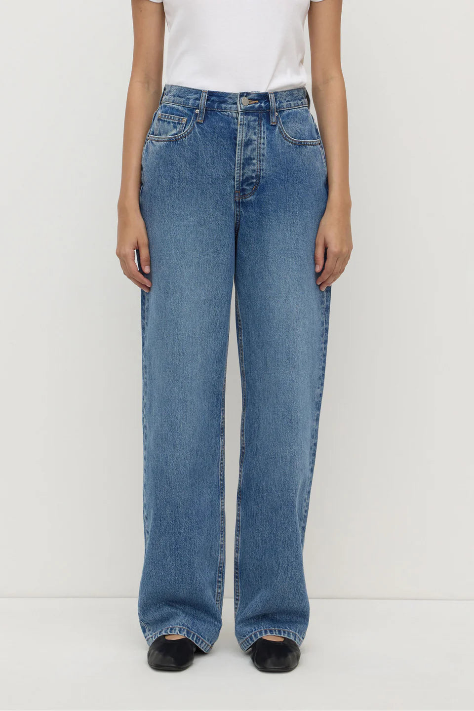 The High Rise Straight Jean in classic blue is a 100% rigid cotton denim jean with a high rise and straight leg.
