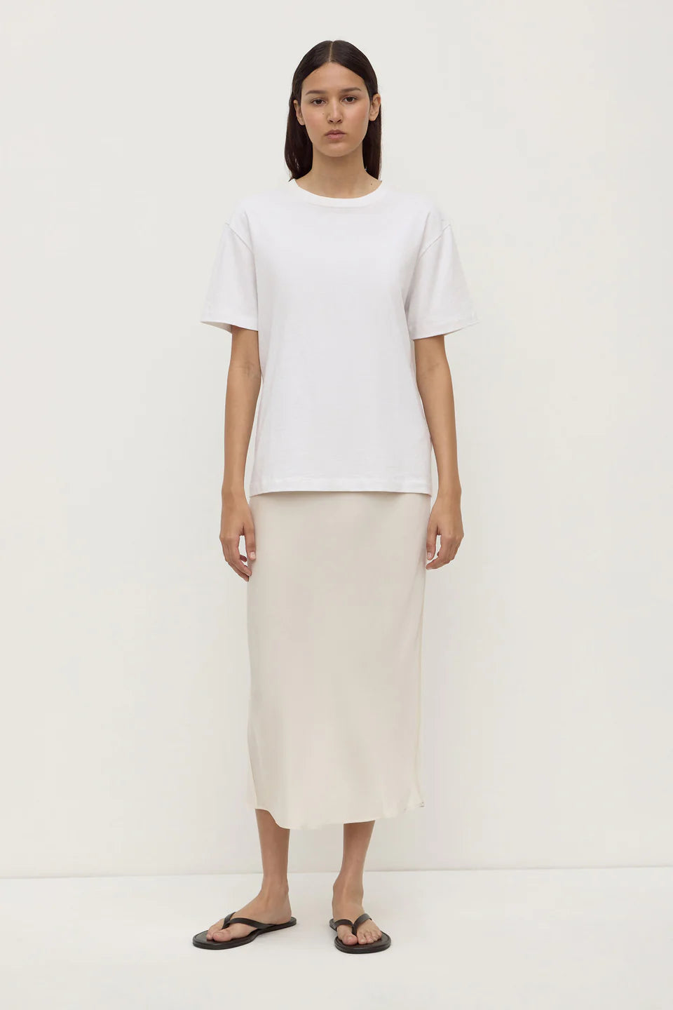 The Amaris Silk Skirt in cream is a 100% silk midi skirt with an elastic waistband and bias cut.